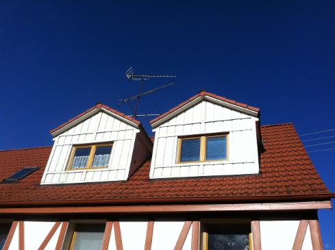 mit Gaupen, Gesimms und Kaminverkleidung
